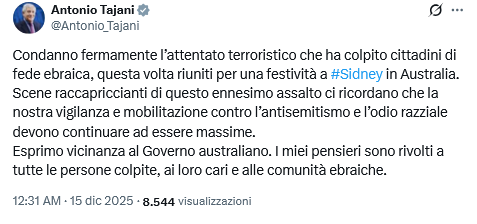 Following the terrorist attack that targeted families gathered to celebrate Hanukkah at Bondi Beach, Australia, the Embassy of Italy expresses its deepest sorrow and extends its thoughts to the victims, the injured, and their loved ones.